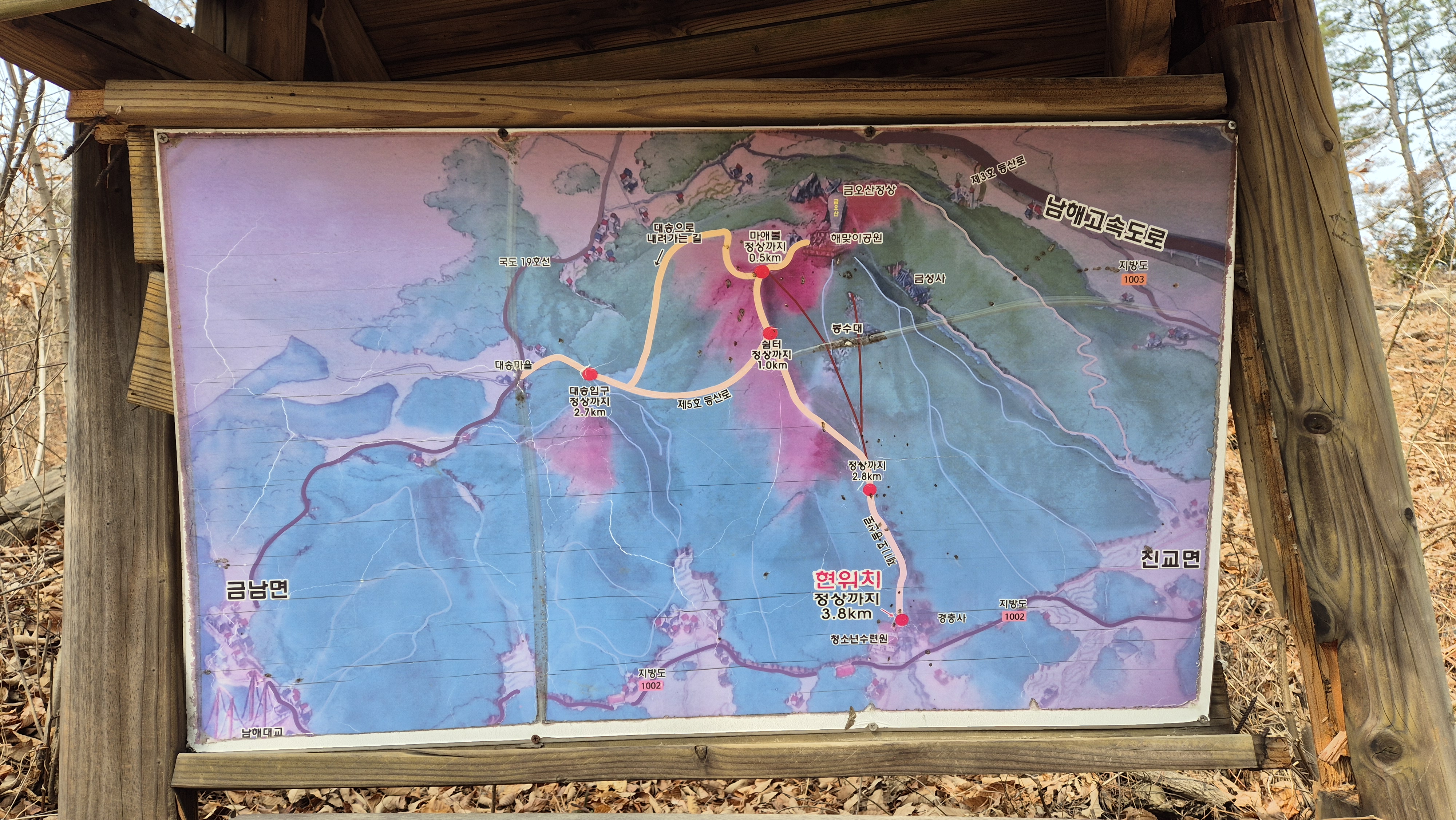 ◇ 코스 : 청소년수련원 ㅡ 아래정기나무 정자 ㅡ 사방교육장 ㅡ 봉수대방향 계곡 ㅡ봉수대 ㅡ석굴암ㅡ 정상. ㅡ 짚라인 탑승구 지나서 대송방향 하산 ㅡ 원점회귀