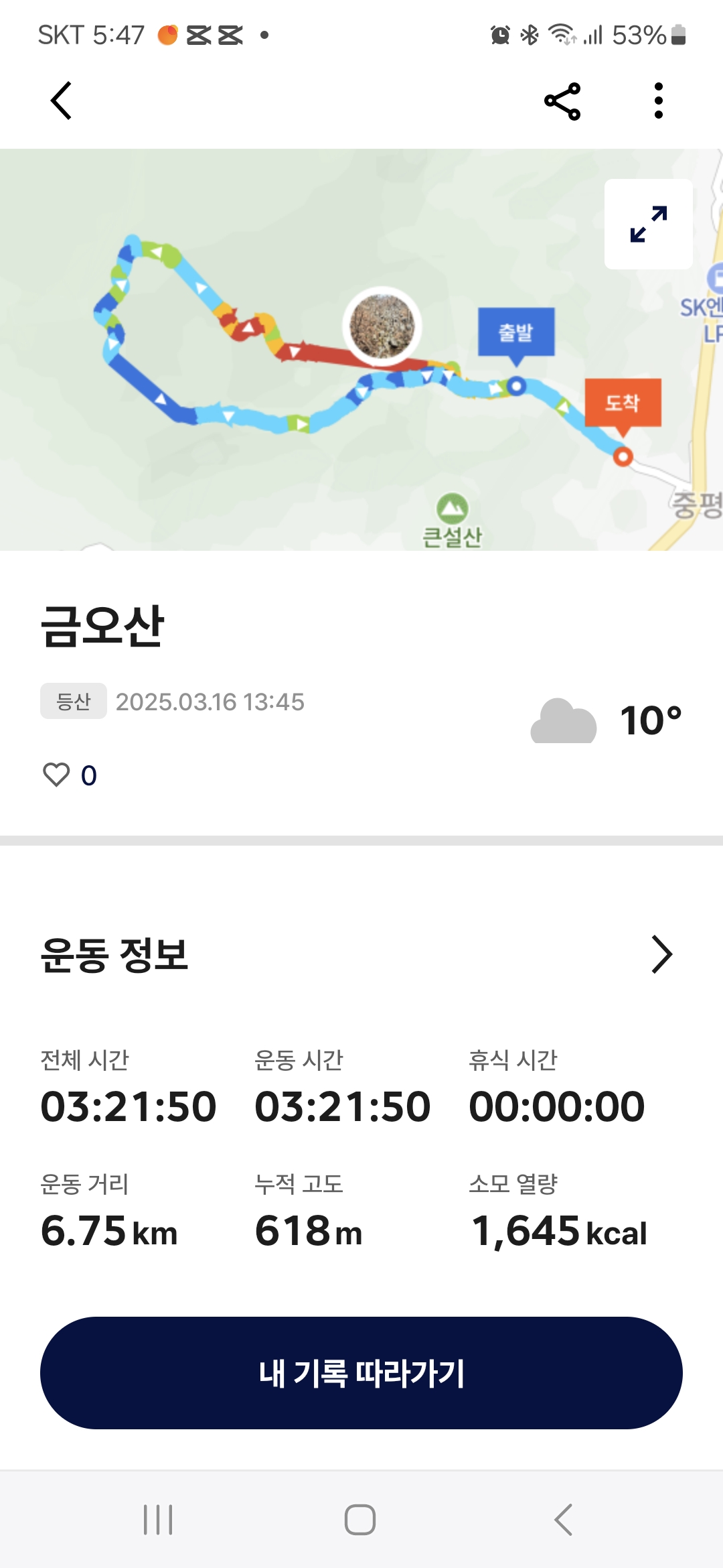 오늘 등산기록인데 올라가는 도중에 측정해서 500미터 정도 기록이 누락되었음